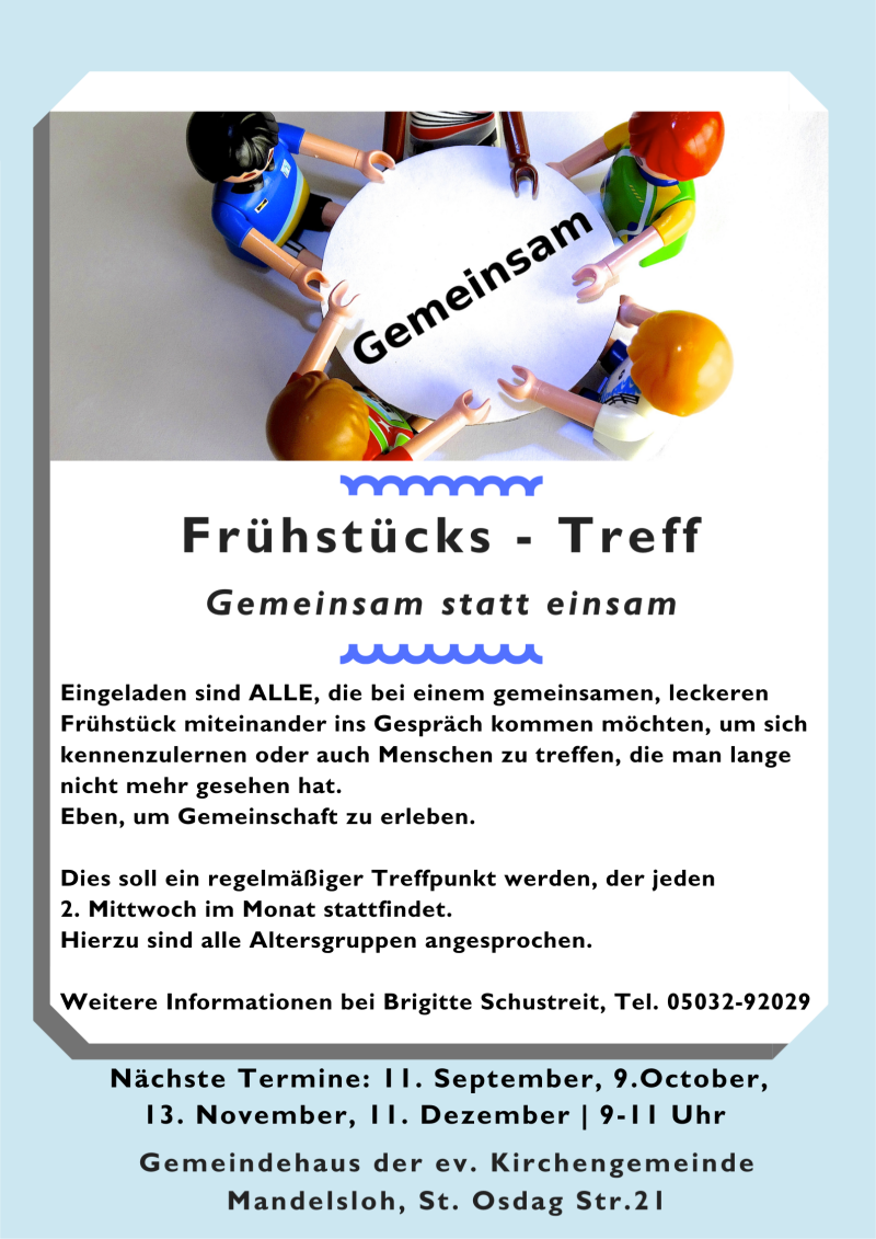 Einmal im Monat wird es ein zwangloses Frühstücks-Treff geben. Unter dem Motto "Gemeinsam statt einsam" wollen wir ins Gespräch kommen.