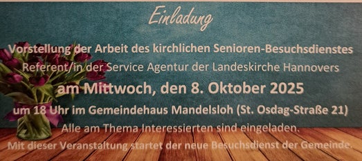 Der Zusammenhalt in unserer Gesellschaft droht immer mehr zu schwinden. Dabei sind Begegnungen zwischen Jung und Alt für beide Seiten sehr wertvoll. Senioren haben einen Schatz an Lebenserfahrung, von denen jüngere Menschen lernen können und umgekehrt kennen sich Menschen, die noch voll im Leben stehen, besser aus mit der modernen Welt. Die Kirchengemeinde Mandelsloh möchte hier ansetzten und Begegnungen fördern. In den jeweiligen Dörfern bzw. Wohngebieten werden Freiwillige gesucht, die Senioren ab 80 Jahre zu ihren Geburtstagen besuchen und mit ihnen ein Gespräch führen. Die Hauptaufgabe des Besuchsdienstes ist somit das Zuhören, das sich Zeit nehmen für den anderen. Die Mitarbeiter sollten selbst in dem Dorf wohnen, in dem sie Senioren betreuen, denn das stärkt den Zusammenhalt. Insbesondere suchen wir noch Interessierte für das Besuchsteam aus den Dörfern Amedorf, Bevensen, Evensen, Welze und Mandelsloh (Wohngebiete Überm See und Mühlenweg). Die Auftaktveranstaltung wird am Mittwoch, den 8. Oktober, um 18 Uhr im Gemeindehaus Mandelsloh sein. Frau Brendel von der landeskirchlichen Beratungsstelle für Besuchsdienstarbeit wird über die Aufgabe, Schulungen, Beratungs- und Vernetzungsmöglichkeiten informieren. Alle Interessierten sind eingeladen, den neuen Besuchsdienst kennenzulernen. Eine Entscheidung zur Mitarbeit kann später getroffen werden. Für Rückfragen vorab steht Maren Pauselius-Gallon (tel. 05072-1289) zur Verfügung.