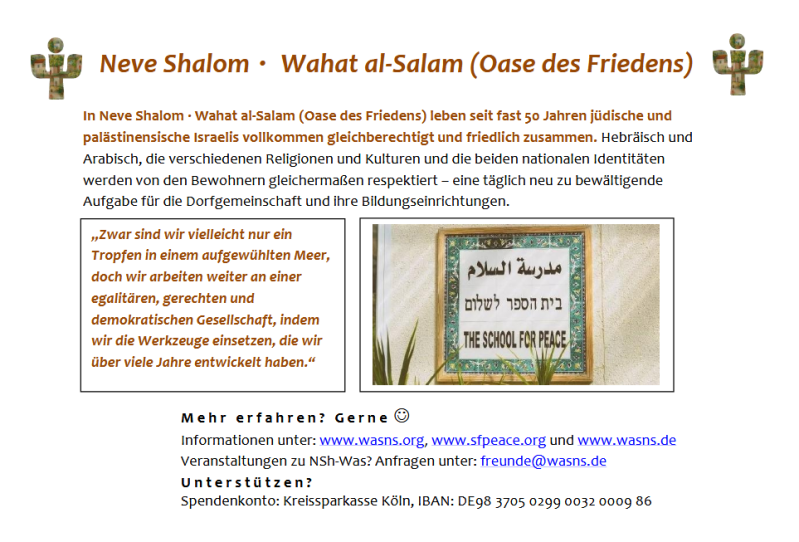 Das Konzert „Annes Tagebuch“ wird Anlass sein, von dem Projekt Neve Shalom zu hören. Statt eines Eintritts wird um Spenden für dieses "Licht-Projekt" gebeten.